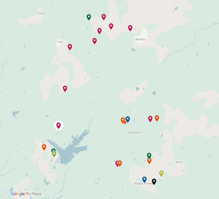 especially in and around the Iola, Bedias, Roans Prairie, Singleton, and Gibbons Creek areas.